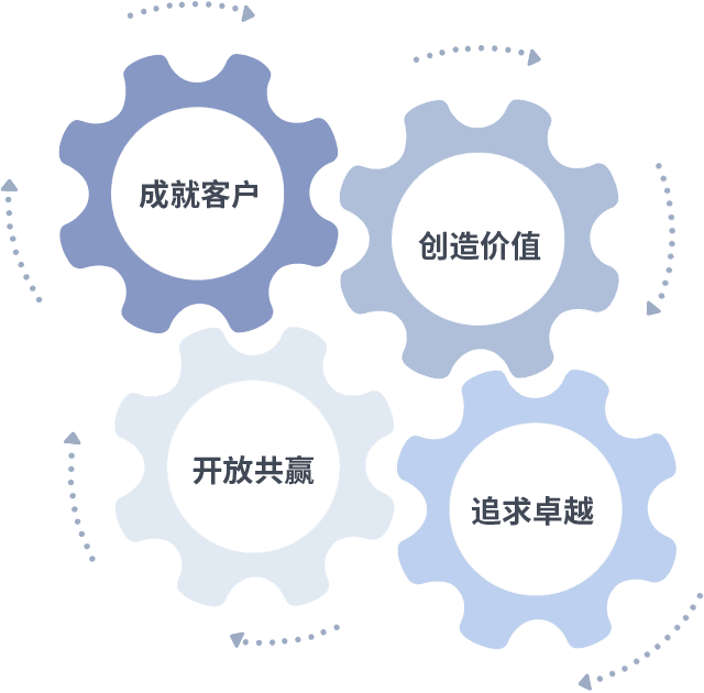 成就客户是一切决策的出发点,,,,创造价值是衡量所有工作的标准,,,追求卓越是我们做事做人的态度,,,,开放共赢是我们的格局也是最终的结果。。价值观的齿轮环环相扣,,推动着组织里的每个人不断向前。。