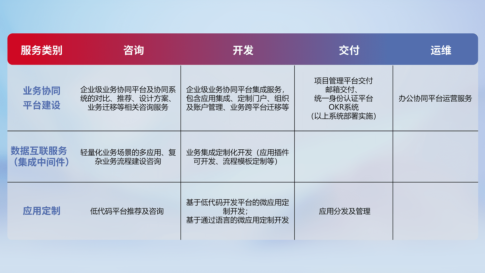 针对钉钉、、、企微、、IDaas等平台级产品提供产品的规划、、、、方案、、、、交付、、定制化开发等服务,,,,实现如统一协同办公、、智能客户服务、、、混合会议管理、、、智能数据查询、、、等业务场景,,实现数字化转型。。